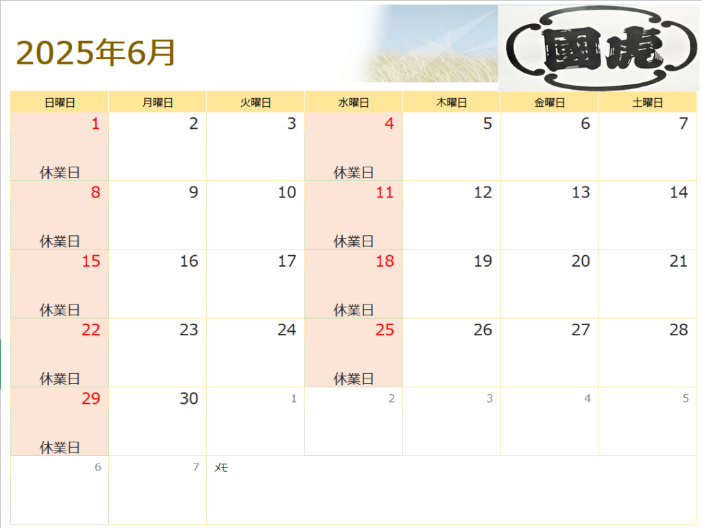 2025年6月の営業日は以下のカレンダーの通りとなります。