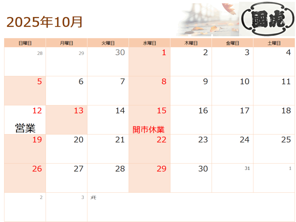 2025年10月の営業日は以下のカレンダーの通りになります。